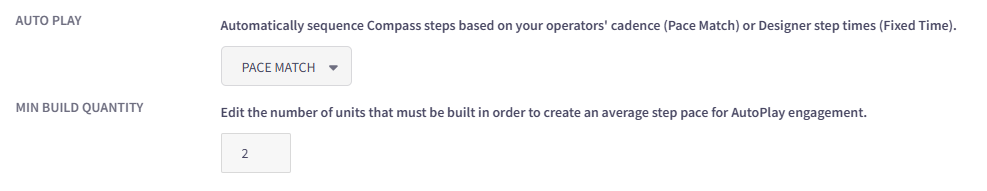 You'll find that each of your separate Work Areas has the Autoplay settings - default is OFF. You can select Fixed Time or Pace Match. If you select Pace Match you can also set the required quantity of units that must be built in order for your Operator's Autoplay sequencing to begin. These first x number of units will essentially train Compass, allowing each operator to build at their own pace.