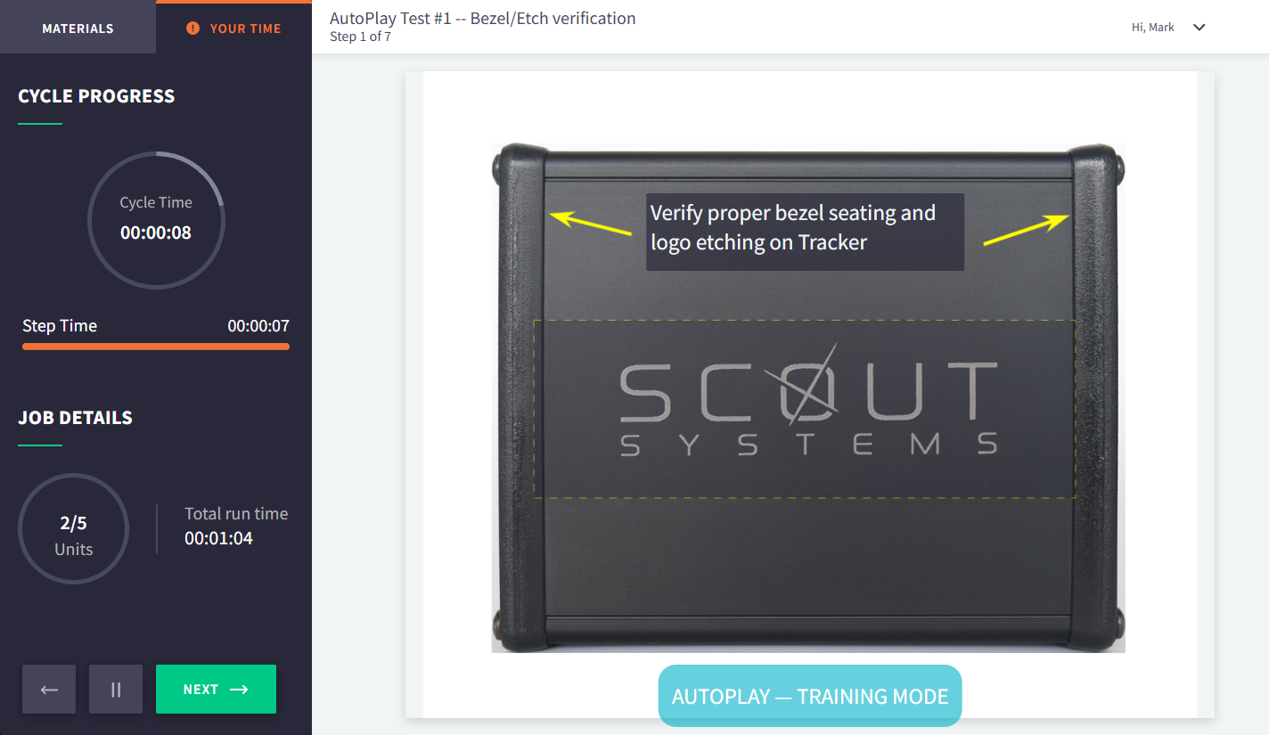 Let's assume you've set your Work Area to 'Pace Match', you require 2 units to be built before Autoplay engages, and your veteran Operator has turned the feature on for their account. Everything you're used to with regard to starting a job will appear the same. However, as soon as you begin building the first step you'll notice our 'Autoplay - Training Mode' blue pill at the bottom of your step instructions.