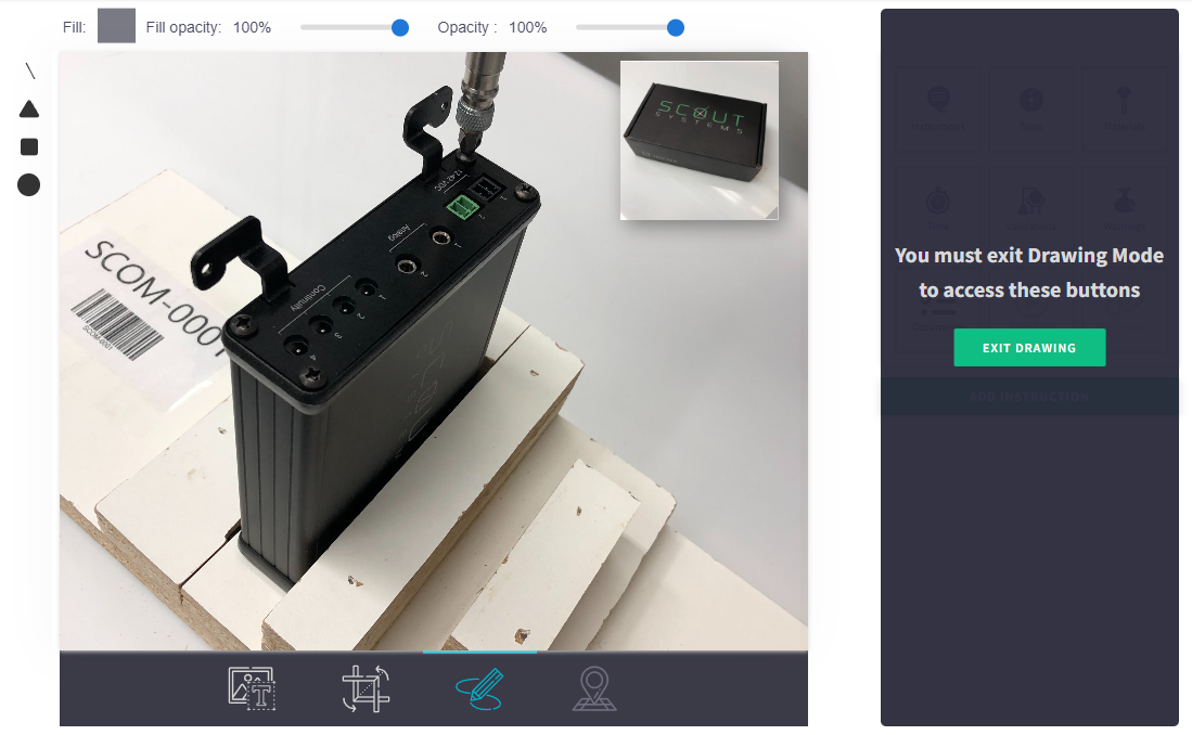 When you click on the 3rd icon from the left, located below the Step Image, the tool will switch to the Drawing Editor. With this feature engaged, you gain the ability to draw directly on your main image. To the left of the Step Image, you can select the shape you intend to use for your drawing. Above the Step Image, you will find options to specify the colors and weights of the shapes you draw. This powerful drawing tool enables you to annotate your images and add important visual cues or notes directly to the Step, enhancing the clarity and comprehensiveness of your Work Instructions.