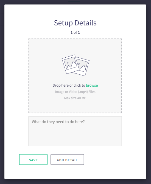 To save the changes you've made in the Setup Details, simply click on the "SAVE" button. If you have multiple instructions that you want to include in the Setup Details, you can press the "ADD DETAIL" button. This allows you to add additional images and accompanying text to cover various aspects of the setup procedure comprehensively.
