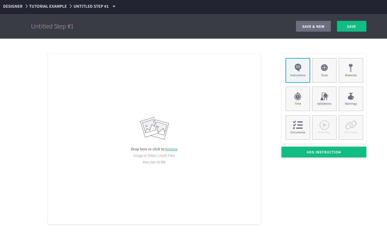 Work Instructions are constructed using individual Steps, which represent the specific actions required of your production staff. To create a Step and access the editor, click on "ADD STEP" from the ADD Menu.