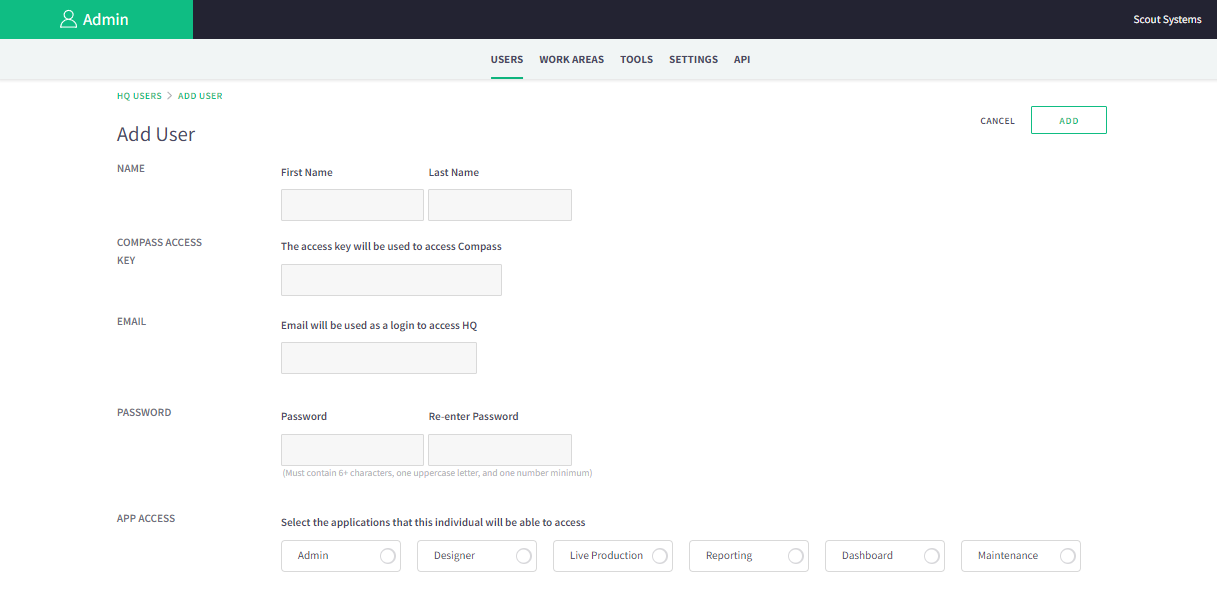 Adding Compass users is very similar. Start by pressing the green + sign box to the right of the words "Operators" from the USERS page.