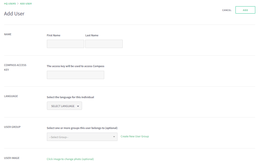 You will need to populate all of the Basic HQ User Settings to ADD a new user. The COMPASS ACCESS KEY is used to access Compass and is typically the employee badge number.