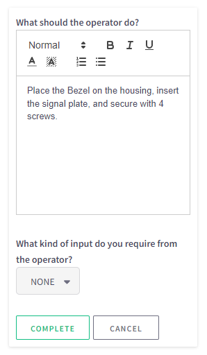 With the editor open, you can type in your instructions while editing the text size and colors. Once the text is ready, press the "COMPLETE" button to have it generate on the Step Image.