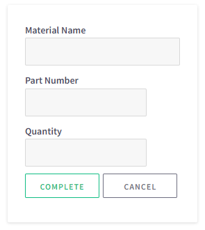 Include the Material Name (or Description), the Part Number, and an integer value to represent the Quantity. When satisfied, press "COMPLETE".