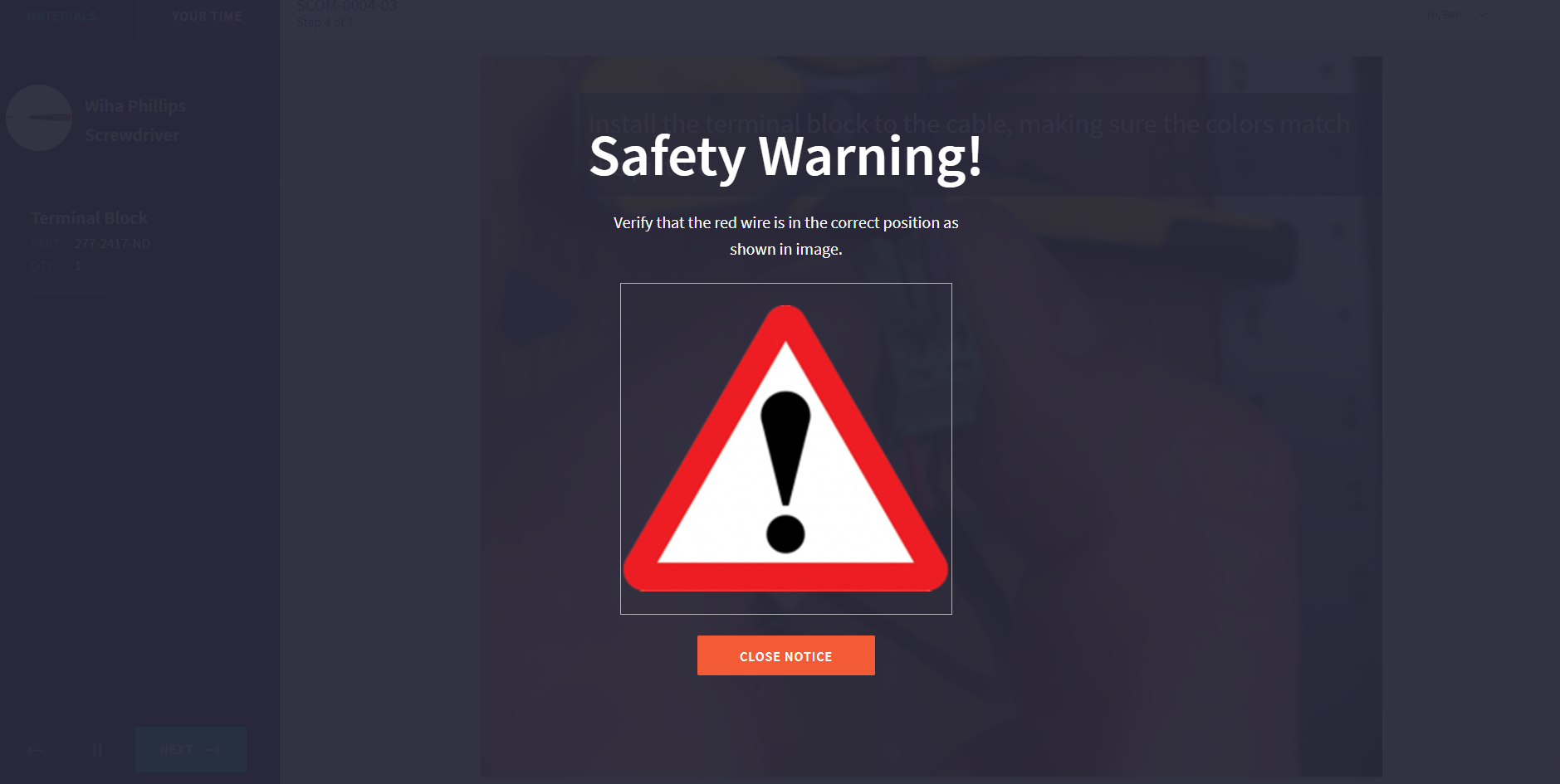 In Compass, Warnings will be displayed at the beginning of a Step, and Operators will be prompted to acknowledge and close the Notice, ensuring that they have seen and understood the Warning message. This feature helps to ensure that critical safety information or important instructions are properly communicated to the Operators, reducing the likelihood of overlooking crucial details and enhancing overall safety and compliance during the production process.