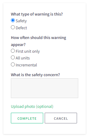 Here, you will be able to set Safety and/or Defect Warnings (1 of each max per step). You can determine how frequent the Warning will appear, describe the concern, and if desired include a photo.